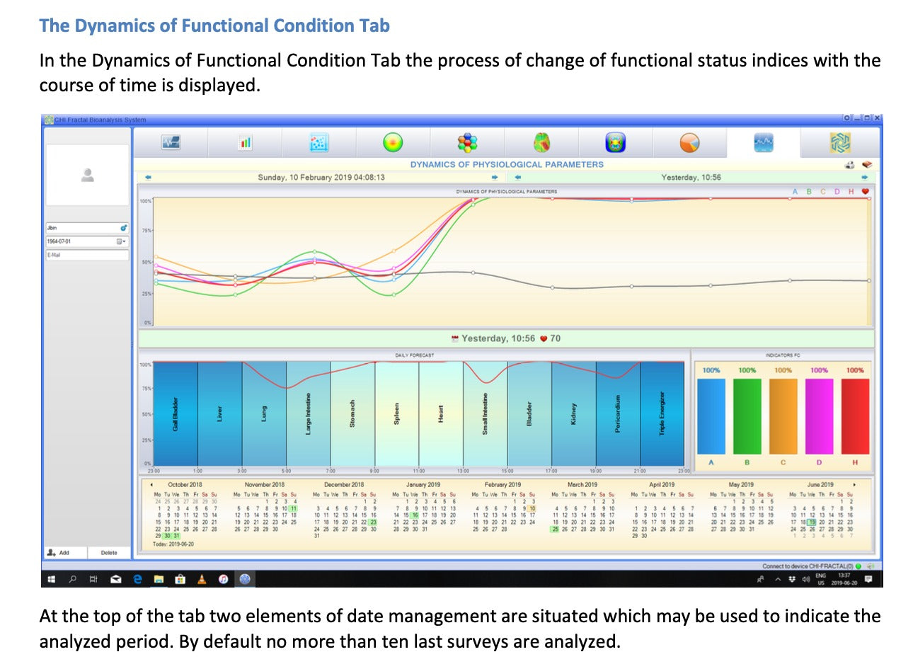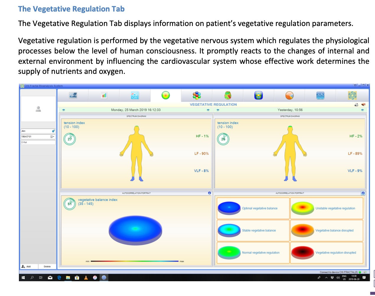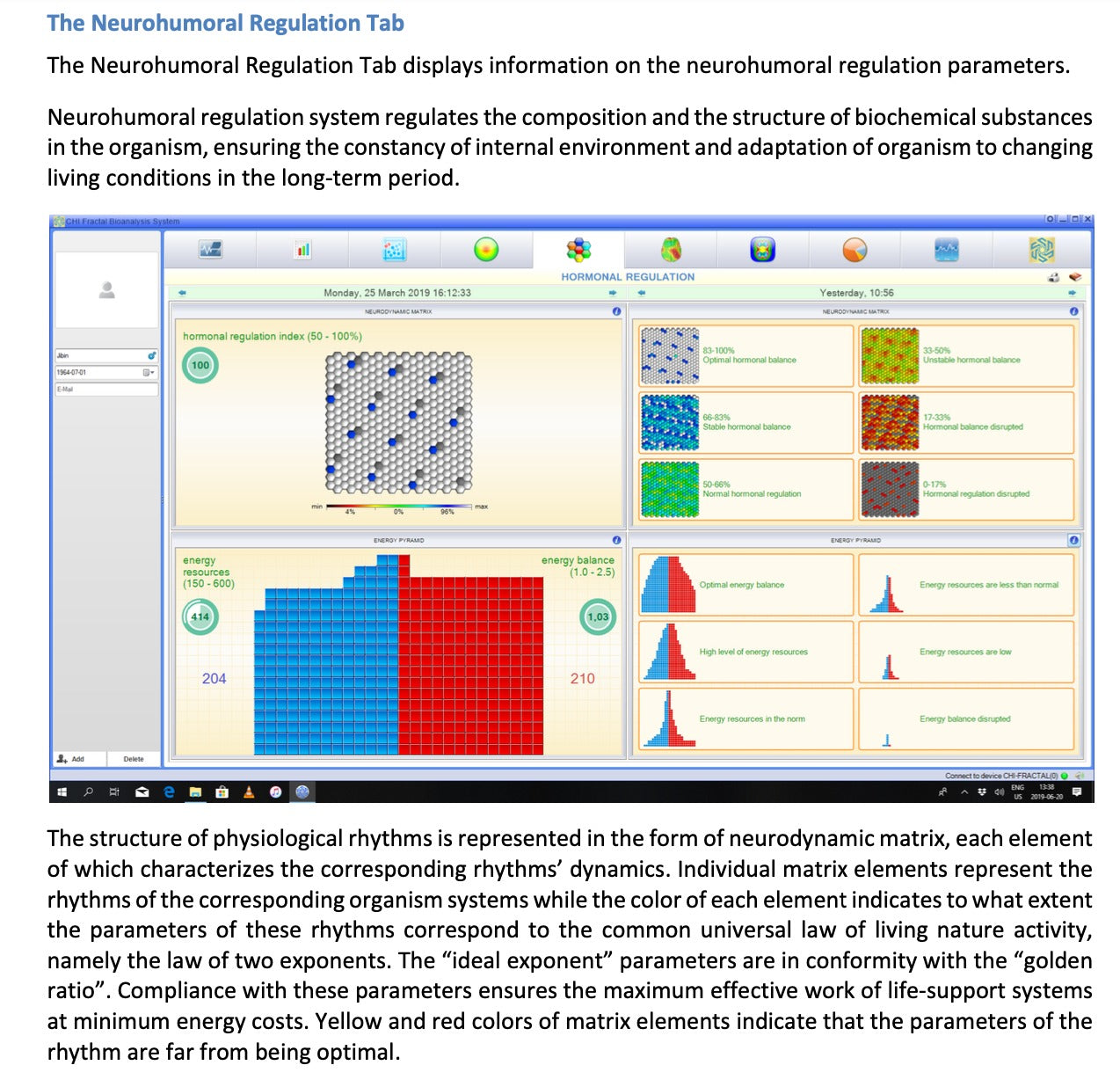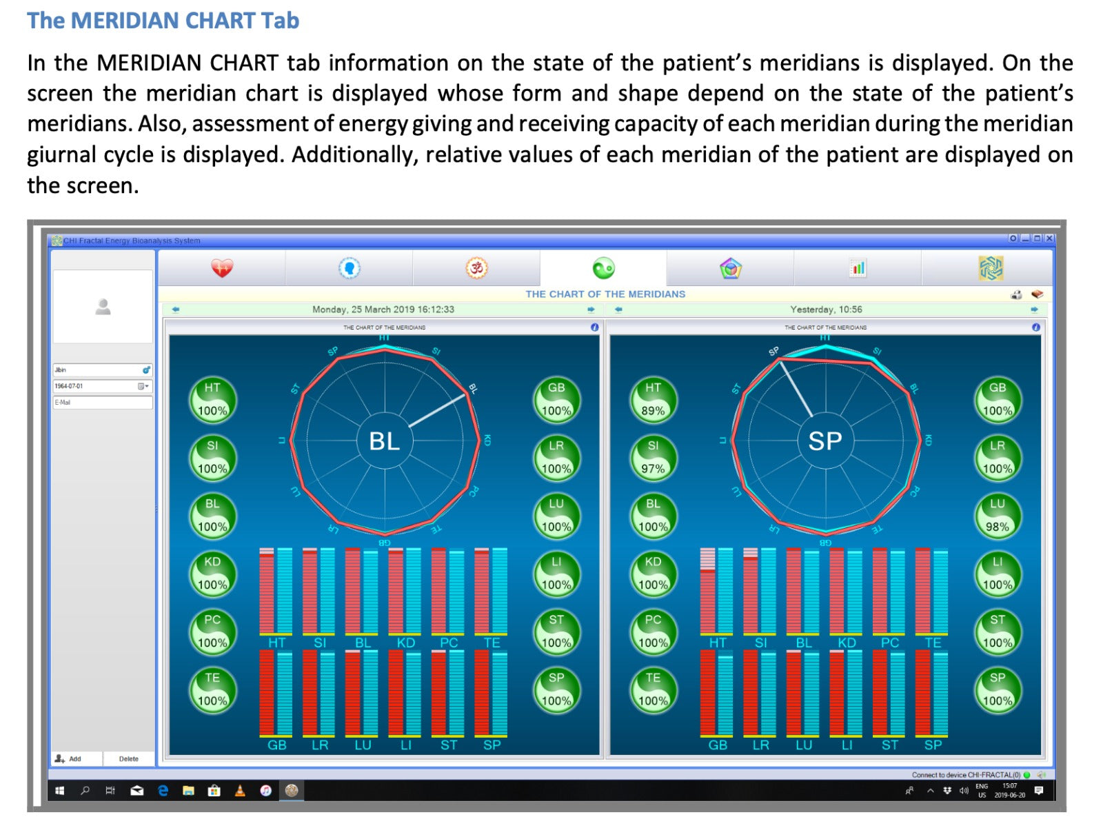 Stress, brain wave analysis, autonomic nervous system balance, total energy and energy balance, circadian rhythm, biological aging, chakras, and meridian energy status can be evaluated using CHI-Fractal Bioanalysis. In addition, it can provide biofeedback in real-time for monitoring treatment and controlling the efficiency of exercises or athletics.