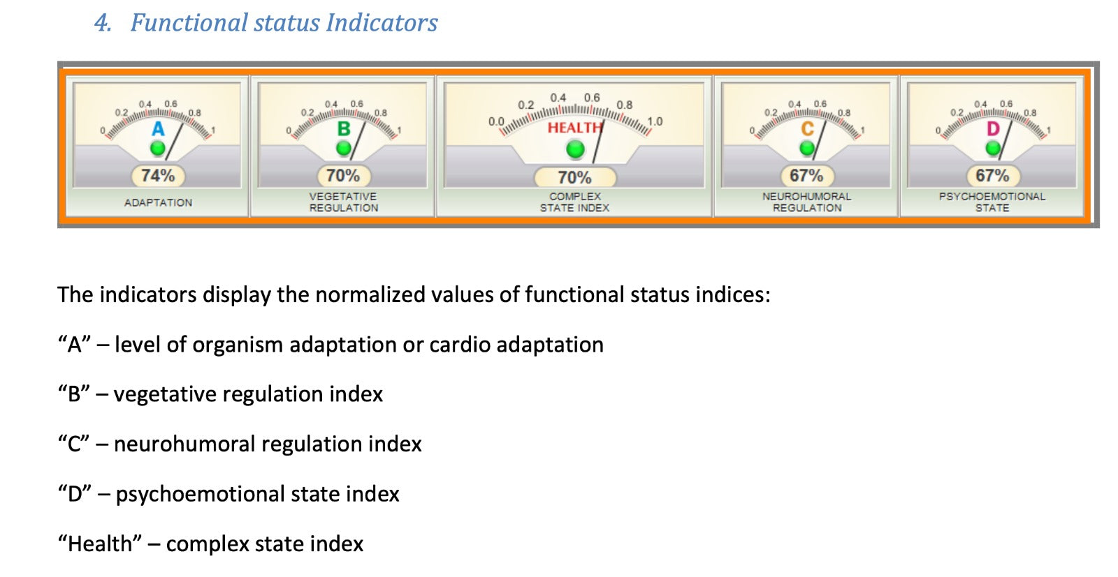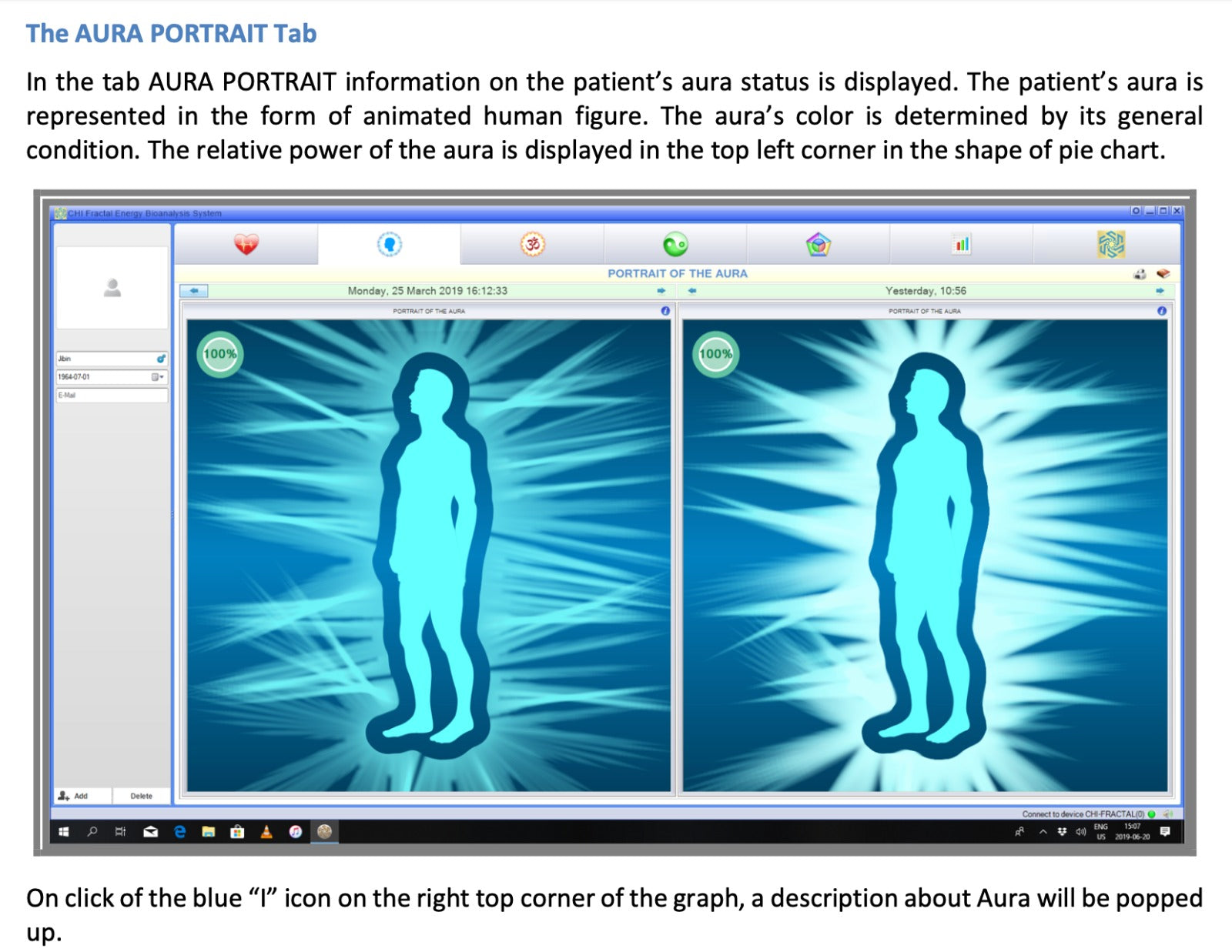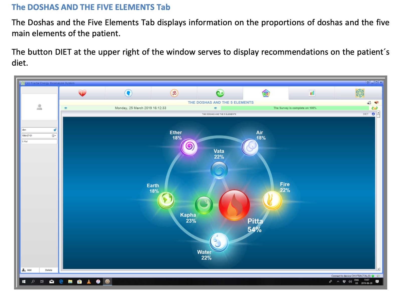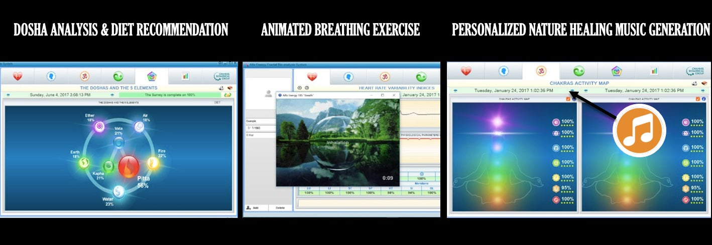 Stress, brain wave analysis, autonomic nervous system balance, total energy and energy balance, circadian rhythm, biological aging, chakras, and meridian energy status can be evaluated using CHI-Fractal Bioanalysis. In addition, it can provide biofeedback in real-time for monitoring treatment and controlling the efficiency of exercises or athletics.